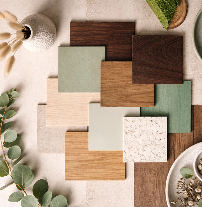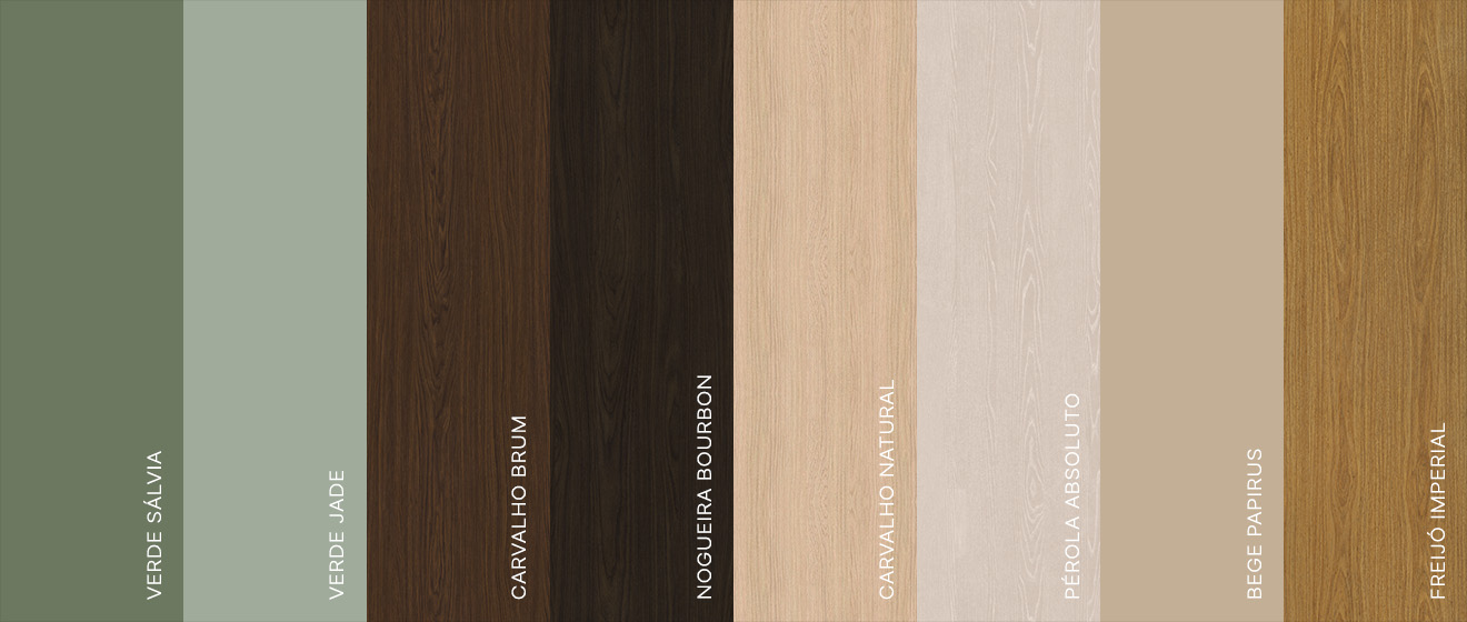 Tons que revelam a natureza em suas diferentes expressões: verdes que evocam o frescor das folhagens, amadeirados que traduzem a força da matéria natural e neutros que conduzem composições com equilíbrio. É da natureza que surgem as inspirações mais duradouras.