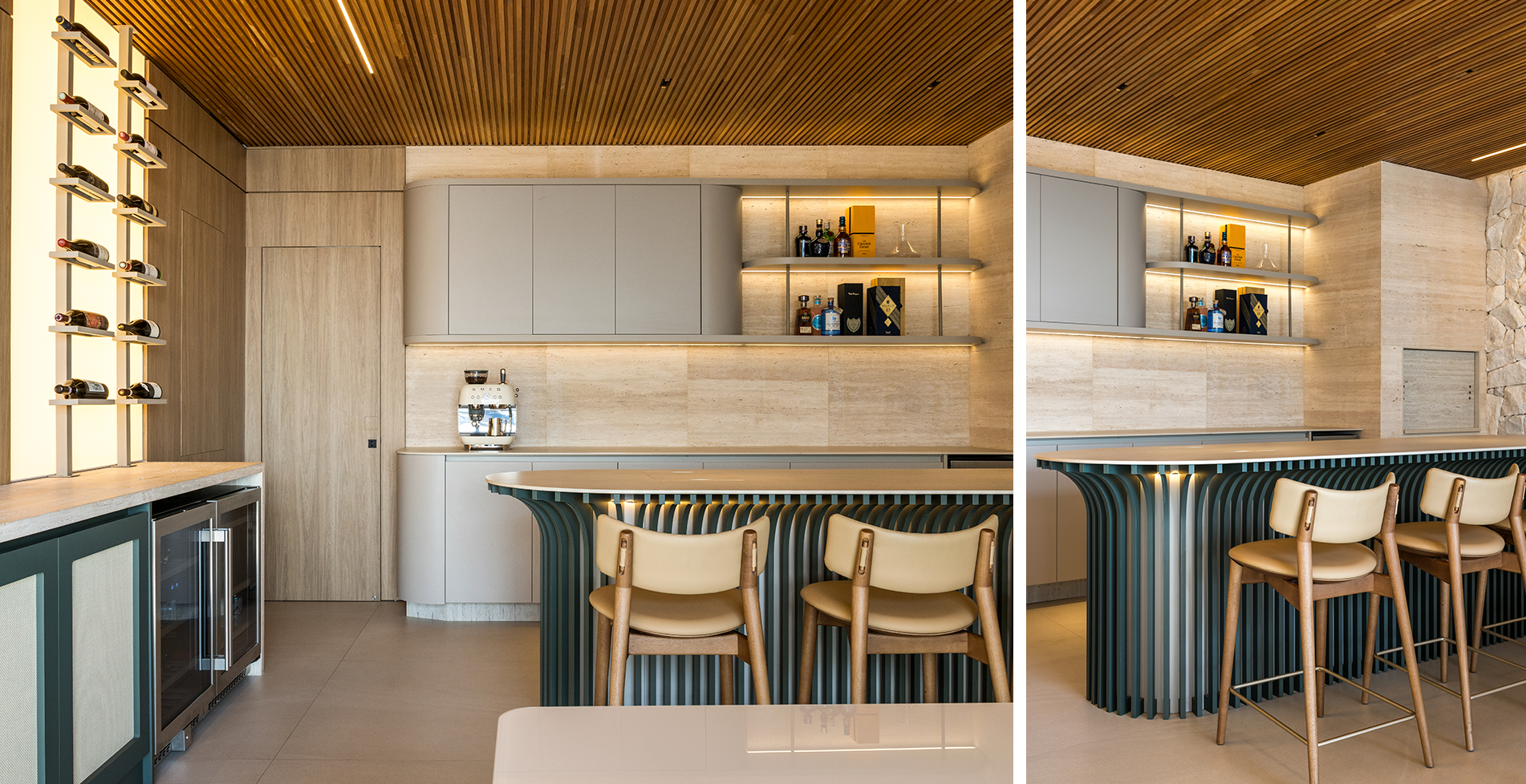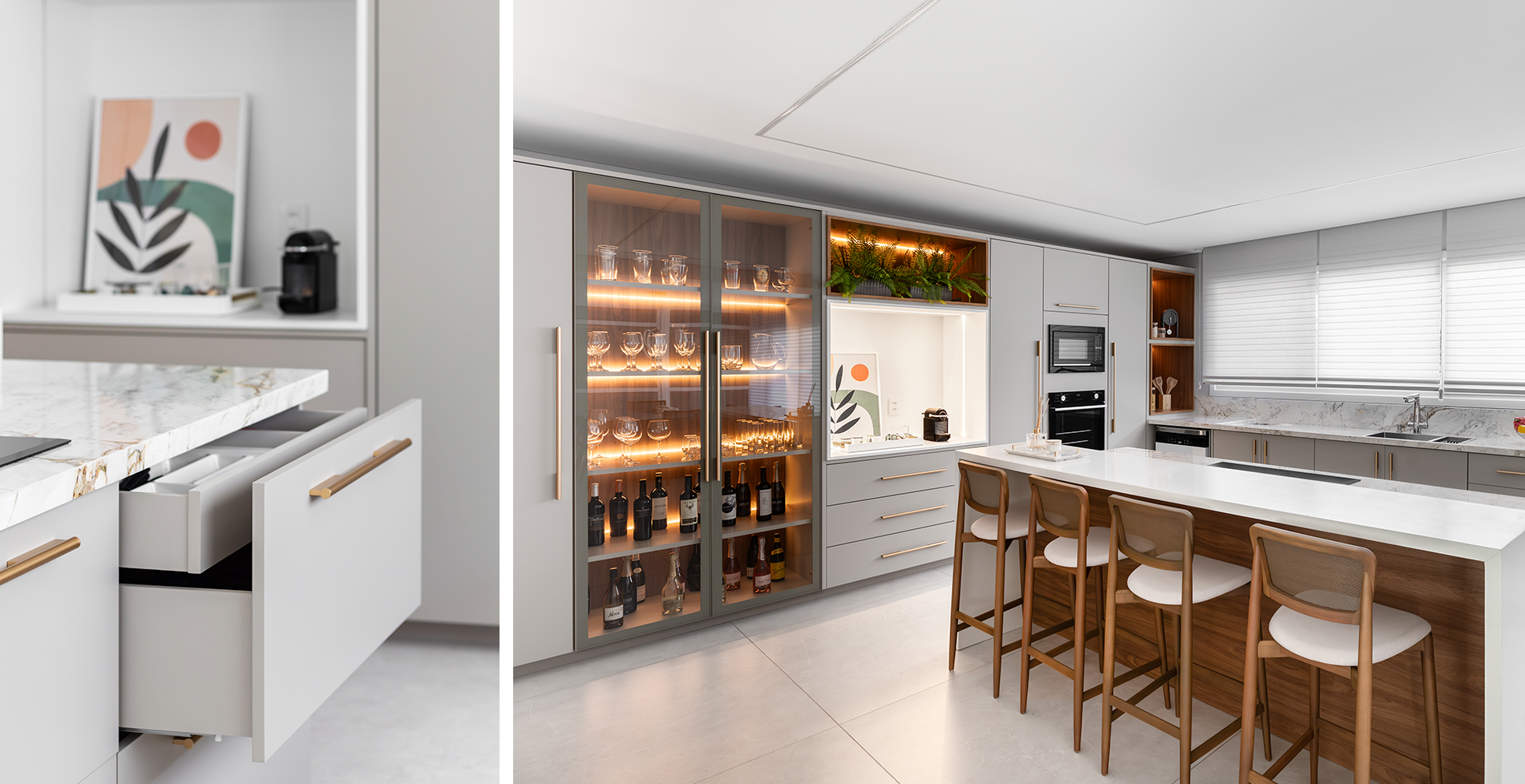 O cantinho do café planejado valoriza os pequenos rituais diários. Nichos para xícaras, máquina, grãos e acessórios, aliados à iluminação pontual, criam uma atmosfera acolhedora, ideal para o início do dia, para receber visitas ou para momentos de pausa.