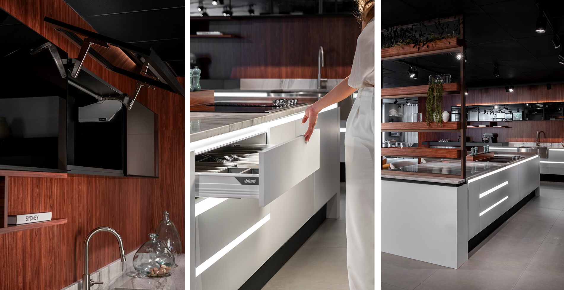 Uma luz bem posicionada nas áreas de trabalho evita sombras, inclusive a sombra do próprio corpo de quem cozinha. Enquanto isso, a iluminação interna em armários, gavetas e cristaleiras facilita a organização e valoriza os materiais. Já a luz mais quente em áreas de convivência cria uma atmosfera convidativa.