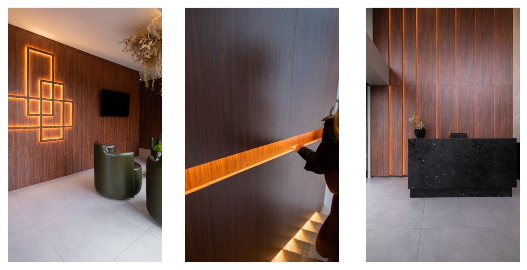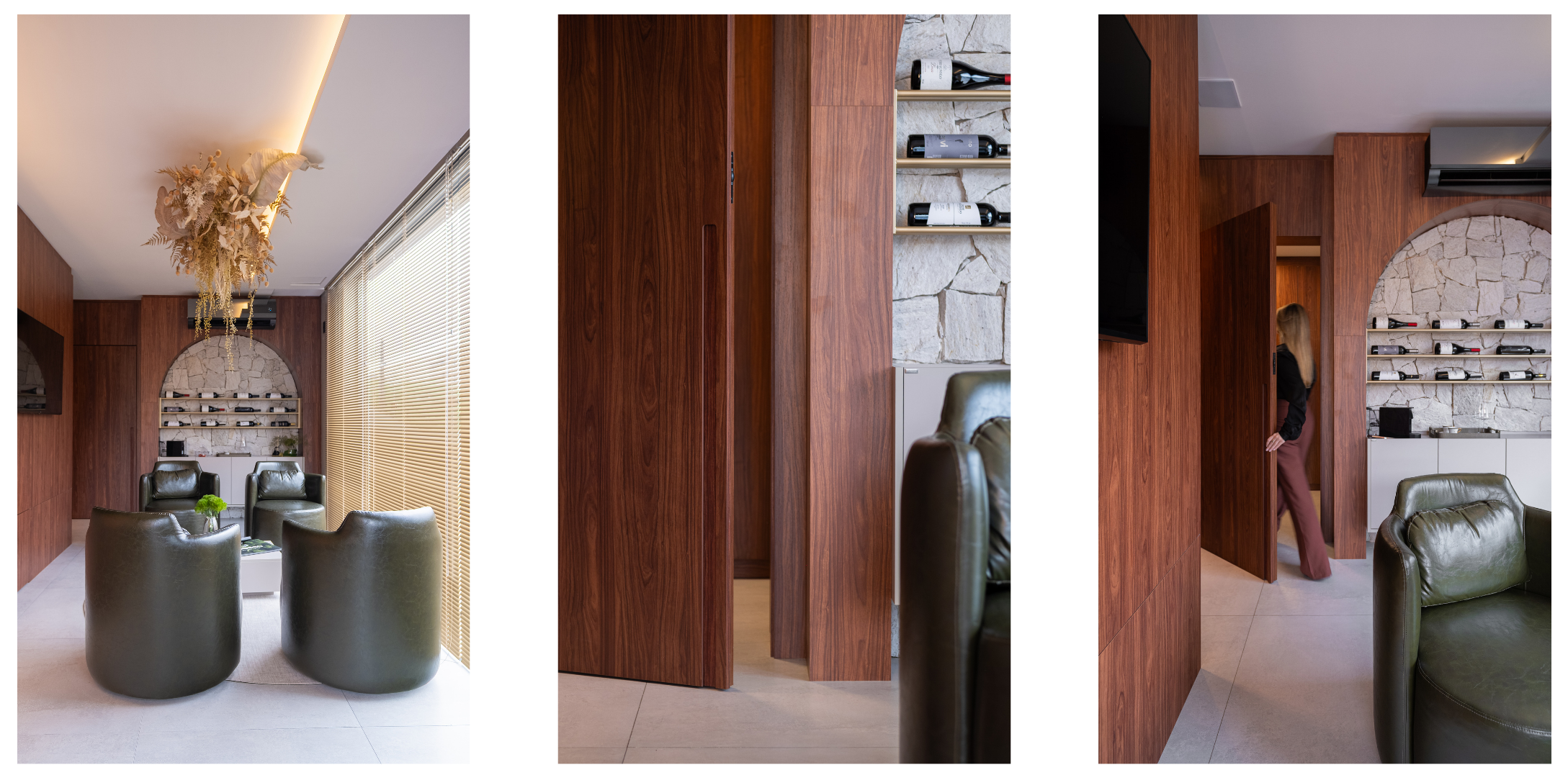 Painéis incorporam portas invisíveis, armários desaparecem na arquitetura e as curvas reduzem a rigidez típica de ambientes corporativos.