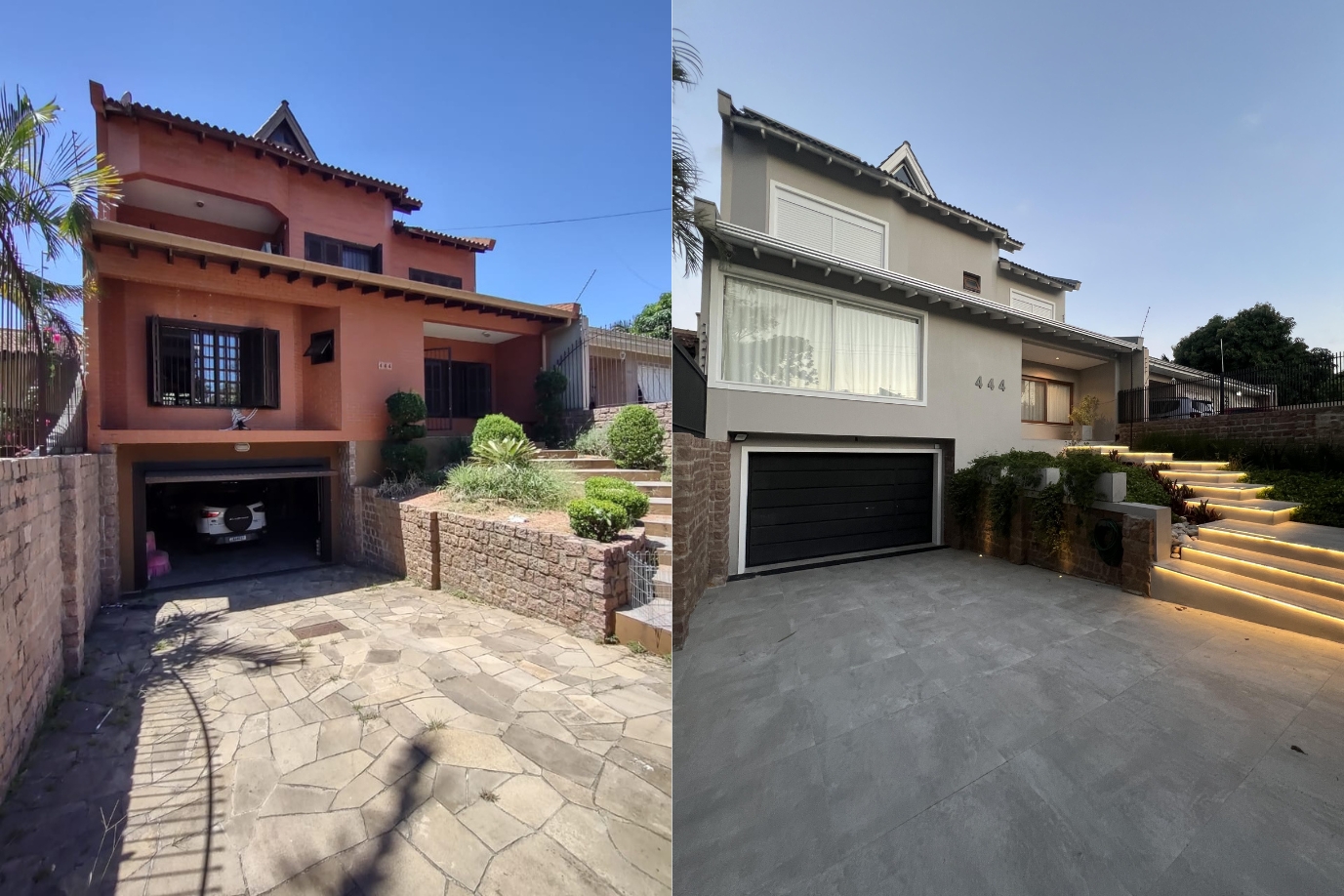 Nas imagens, o antes (esquerda) e depois (direita) da fachada da casa, preservada de maneira a destacar os detalhes e dar vida para a residência.