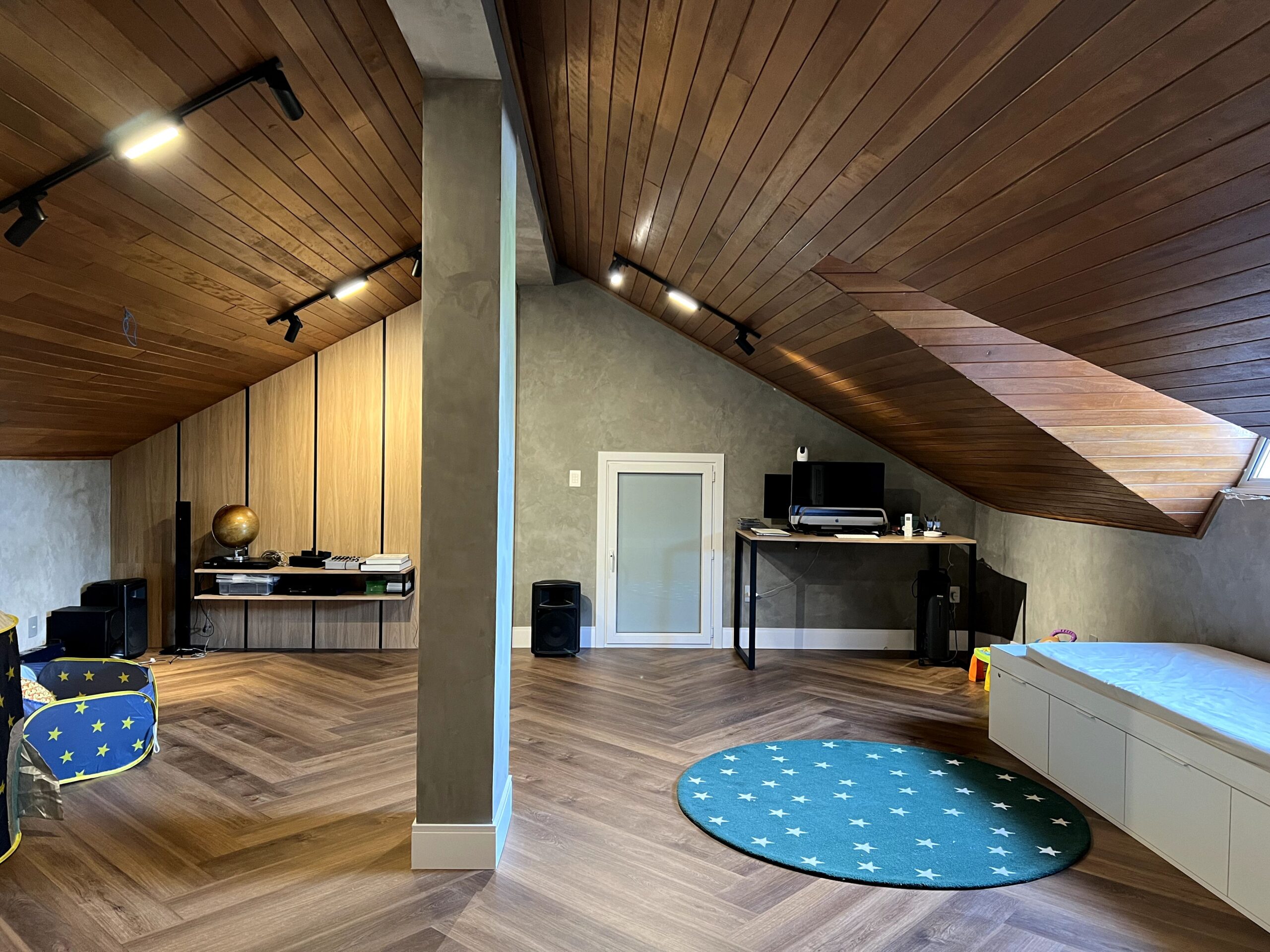É no sótão da casa que o conceito de Retrofit tem mais destaque: um cômodo muito presente em residências antigas, reformado de maneira a se tornar completamente funcional e utilizado pela família, com espaço para escritório e brinquedoteca.